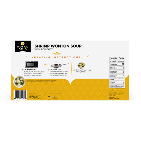 Warm up with the comforting flavors of Royal Asia’s Shrimp Wonton Soup. Featuring delicate wontons filled with farm-raised shrimp and paired with bok choy in a savory broth, it’s a perfect harmony of freshness and flavor. Ready in minutes, this classic soup brings a touch of Asian-inspired comfort to your table.