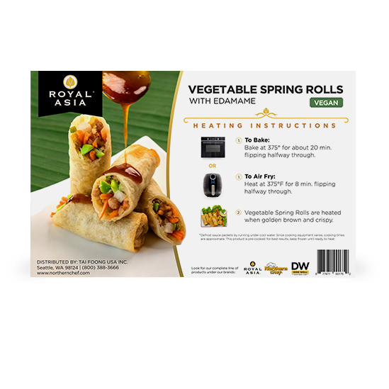 Enjoy the vibrant flavors of Royal Asia’s Vegetable Spring Rolls. Packed with a wholesome blend of jícama, edamame, cabbage, and other fresh vegetables, these rolls are wrapped in a light, crispy pastry. Perfect as a snack or appetizer, they’re a deliciously easy way to add a touch of Asian-inspired flair to any meal.